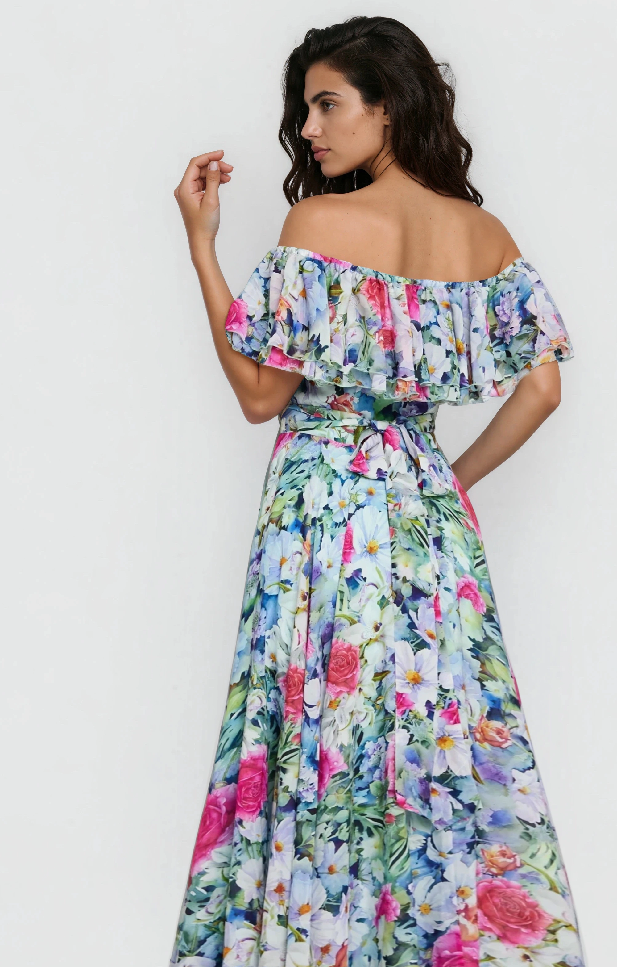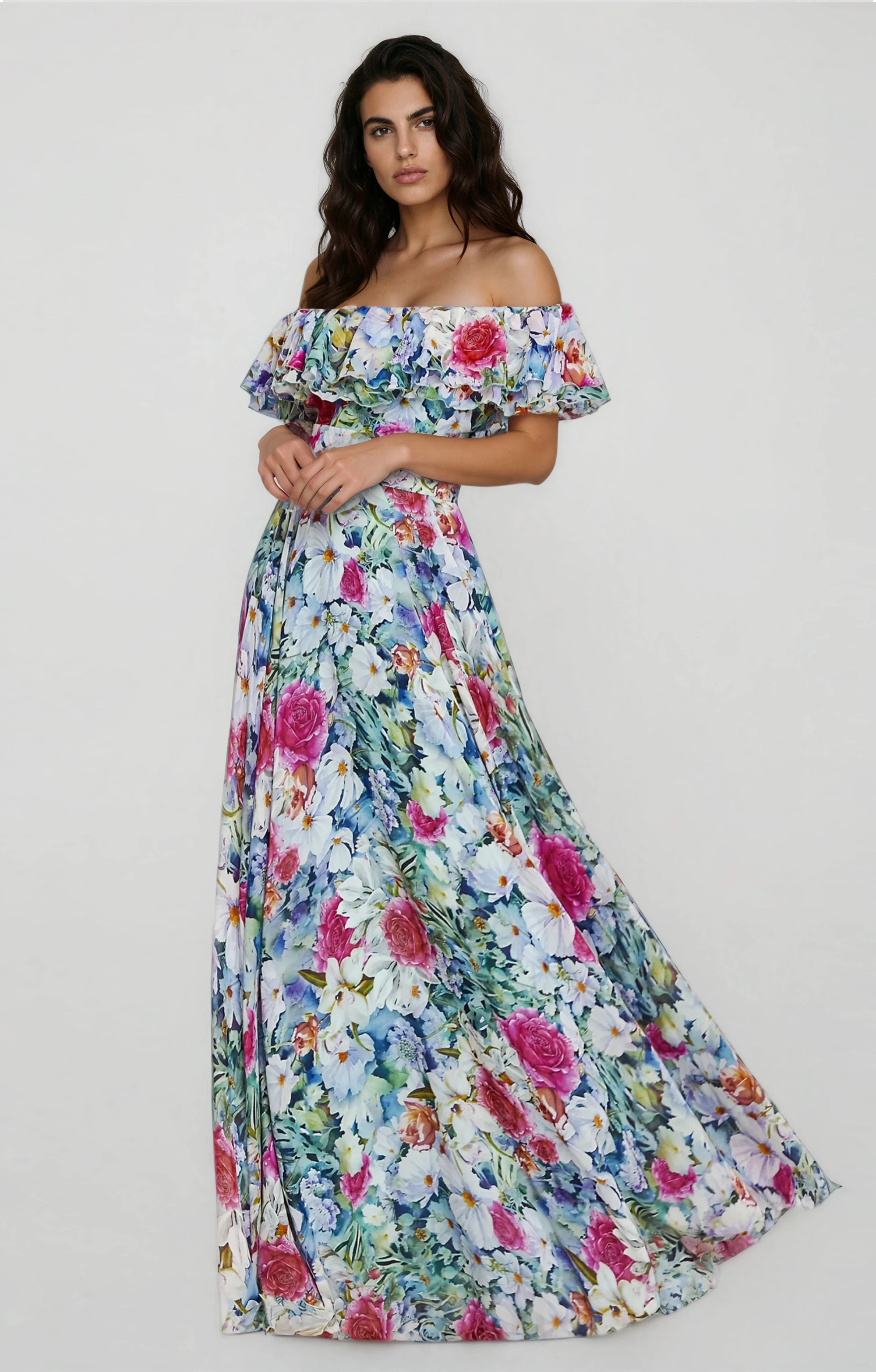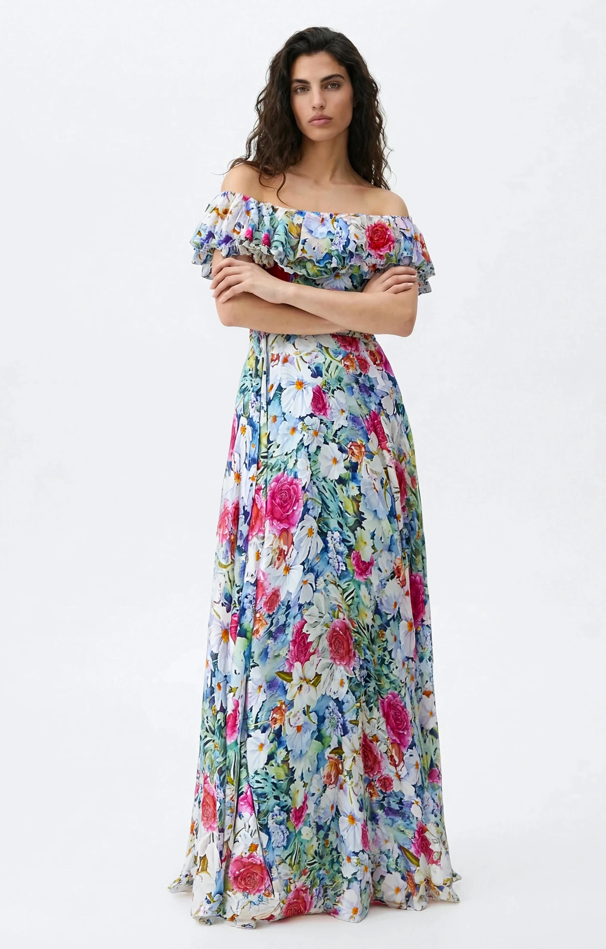 Fühlen Sie sich wie eine Königin in diesem extravaganten Seidenkleid mit schulterfreiem Volant-Oberteil, zart gegürteter Taille und weit schwingendem Rock. Die großzügig verarbeitete Seide umspielt in schimmernden Farben und flatternden Volants verführerisch die weibliche Figur und garantiert einen glamourösen Auftritt. Das elegante, lange Abendkleid im prachtvollen Blumenmuster ist auf jeden Fall ein besonders festliches ein besonders festliches Highlight aus der Kollektion von MATSOUR'I.