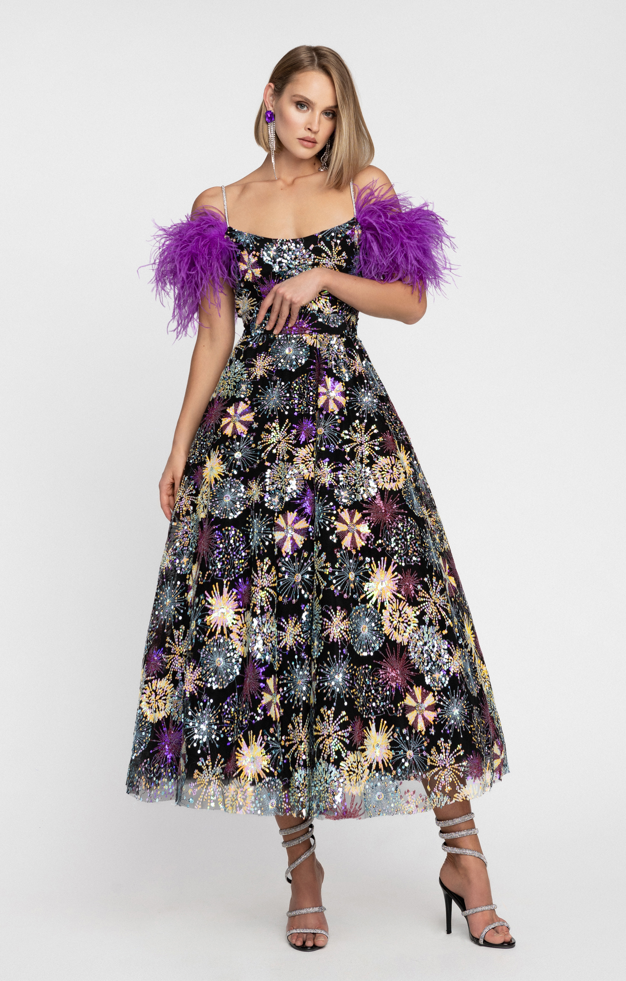 A luxurious New Year’s Eve dress that transforms every celebration into an unforgettable experience. The shimmering fabric is richly embellished with sequins in a breathtaking firework design, sparkling magically with every movement and capturing the enchantment of midnight. The elegant A-line silhouette in midi length creates a feminine shape, while delicate straps beautifully highlight the neckline. The true showstopper: the opulent, detachable sleeves made of vibrant purple feathers, adding an extravagant and glamorous touch.