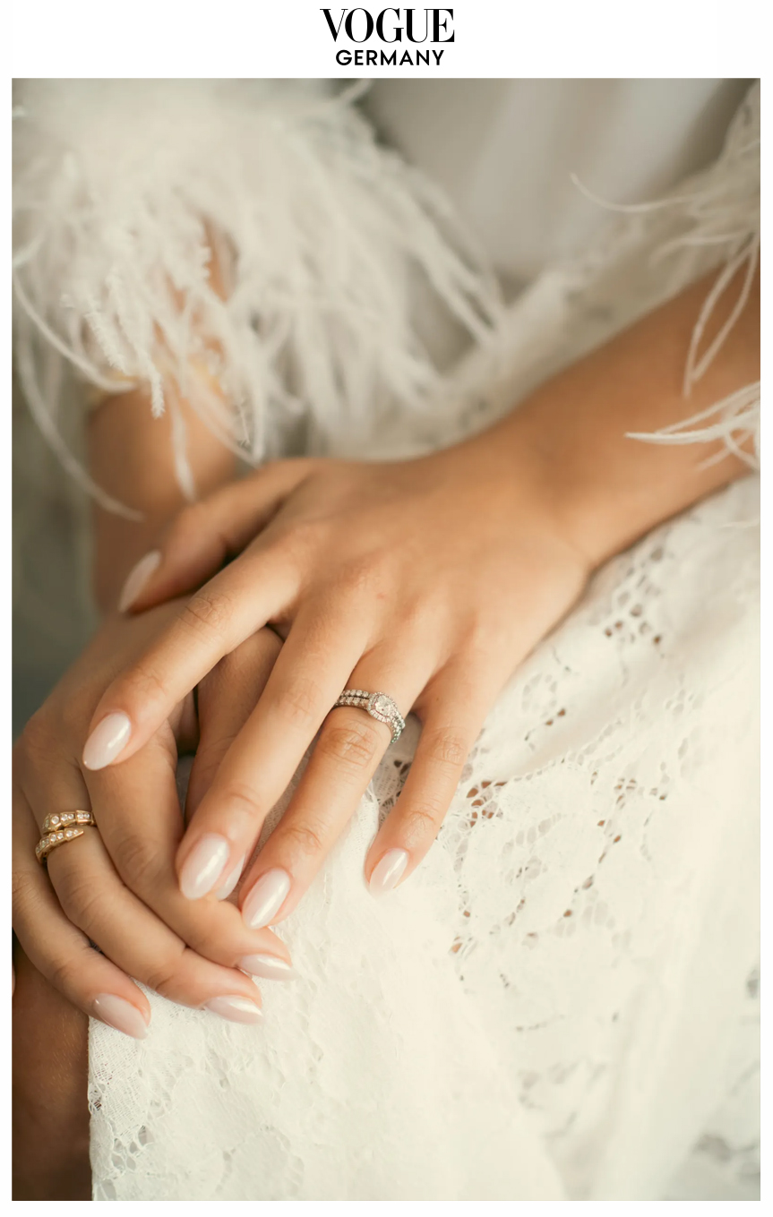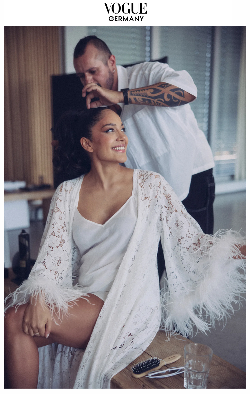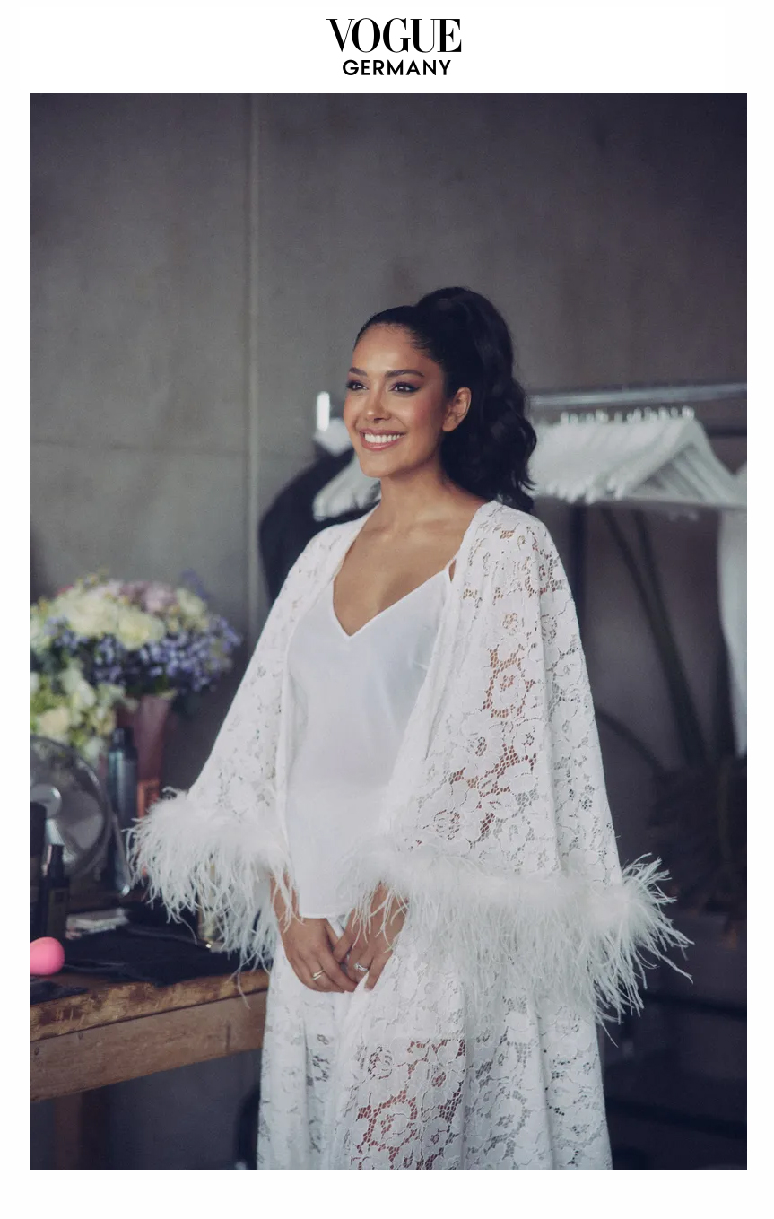 Rahima Schäle in MATSOUR'I feather-trim robe in Vogue Germany