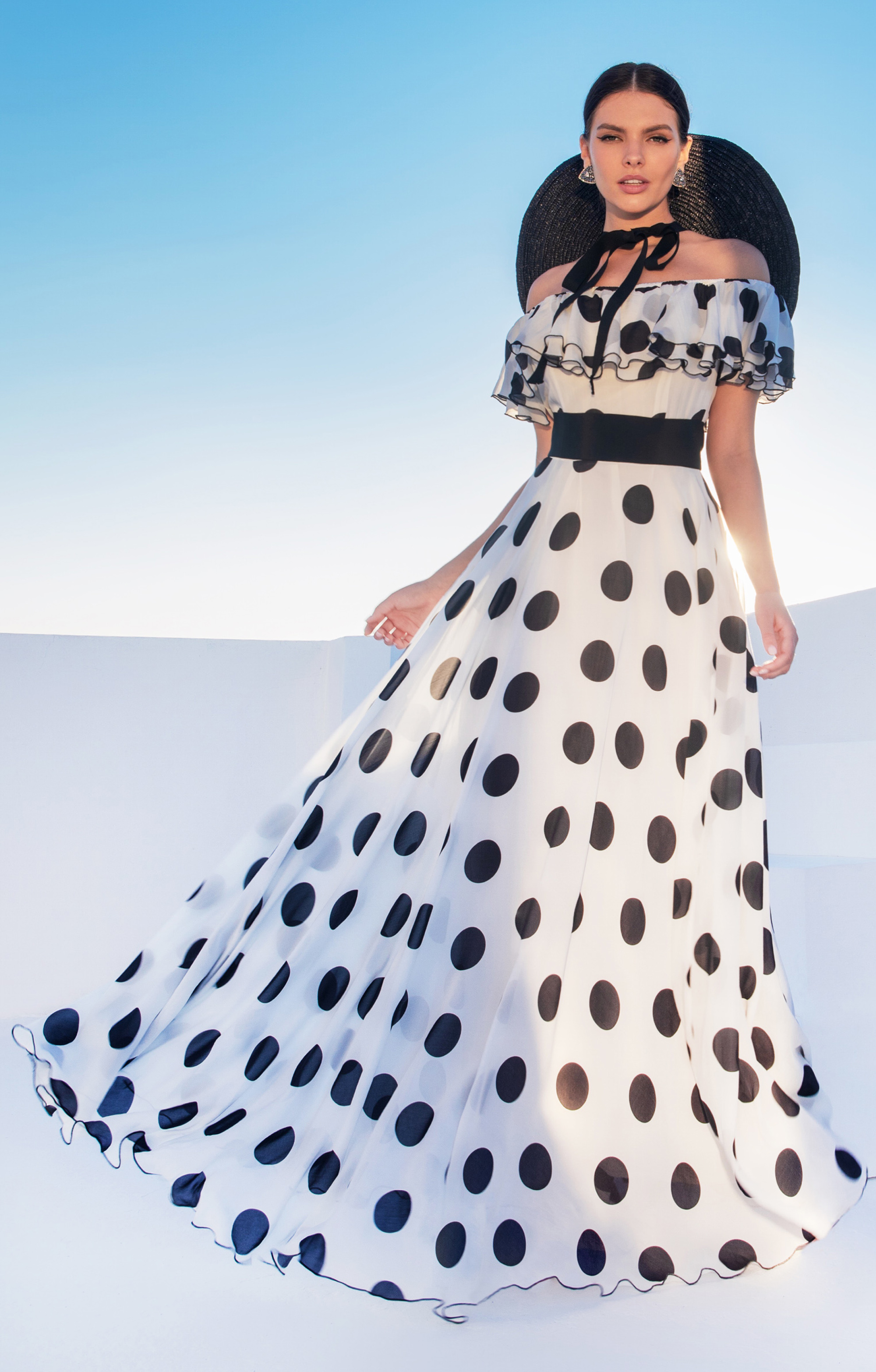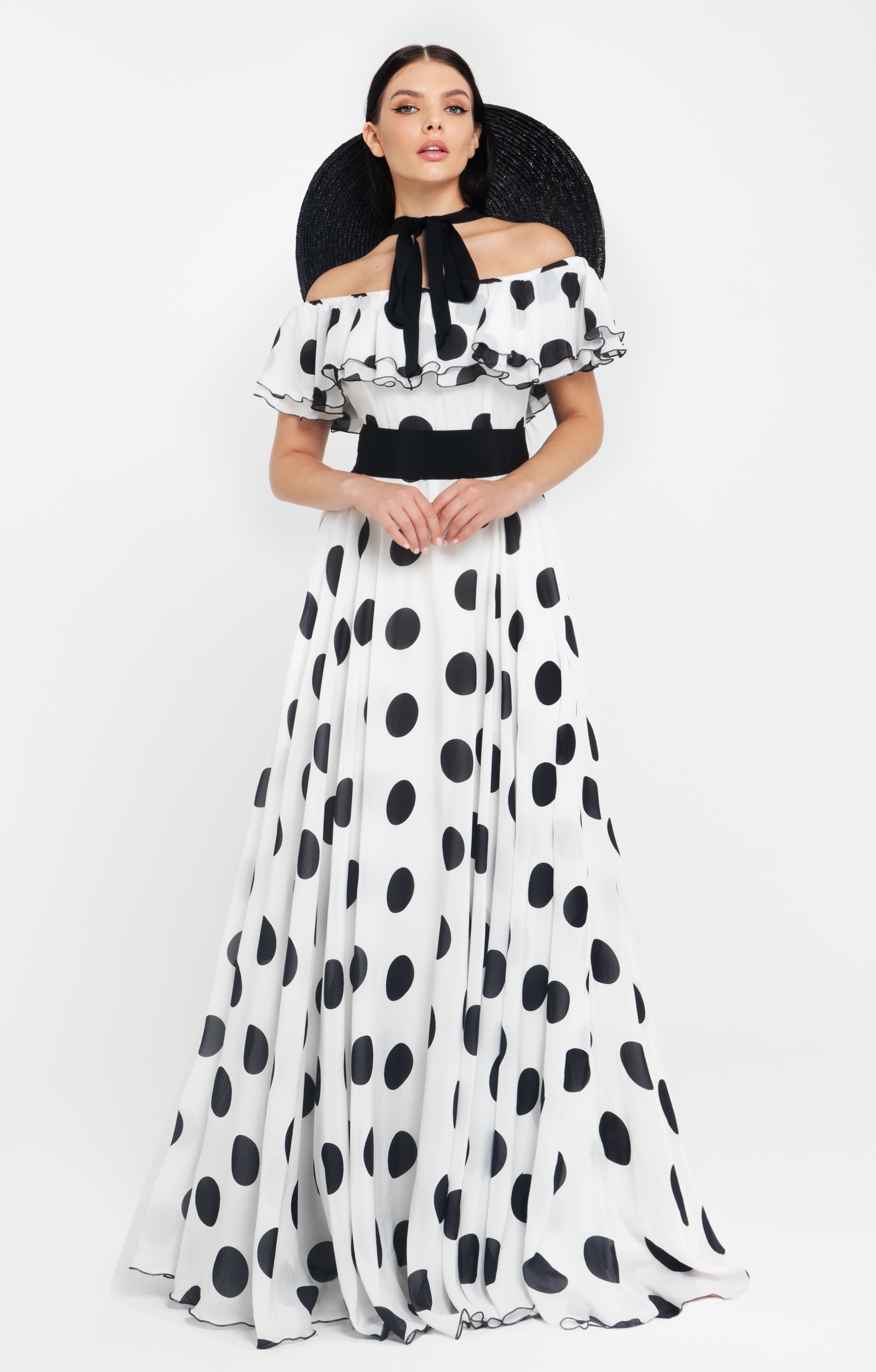 Das Kleid auf dem Bild ist ein elegantes Maxi-Seidenkleid im Retro-Stil, das sofort durch sein zeitloses Polka-Dot-Muster auffällt. Der Stoff ist aus fließender, leichter Seide gefertigt, wodurch das Kleid einen wunderbar schwingenden Fall hat. Das weiße Grundmaterial ist mit großen, kontrastreichen schwarzen Punkten übersät – ein klassisches Muster, das zugleich verspielt und edel wirkt. Das Oberteil ist schulterfrei gestaltet und mit einer doppelten Rüschenlage verziert, die sanft über die Arme fällt. Der Rockteil ist weit ausgestellt und bodenlang, wodurch das Kleid bei jeder Bewegung eine dramatisch-schöne Eleganz entfaltet. Die luftige Leichtigkeit des Stoffes macht es ideal für sommerliche Anlässe, aber auch für glamouröse Auftritte mit Retro-Flair. Das elegante, lange Seidenkleid im Polka-Dot-Print ist auf jeden Fall ein Highlight aus der aktuellen Kollektion von MATSOUR‘I.
